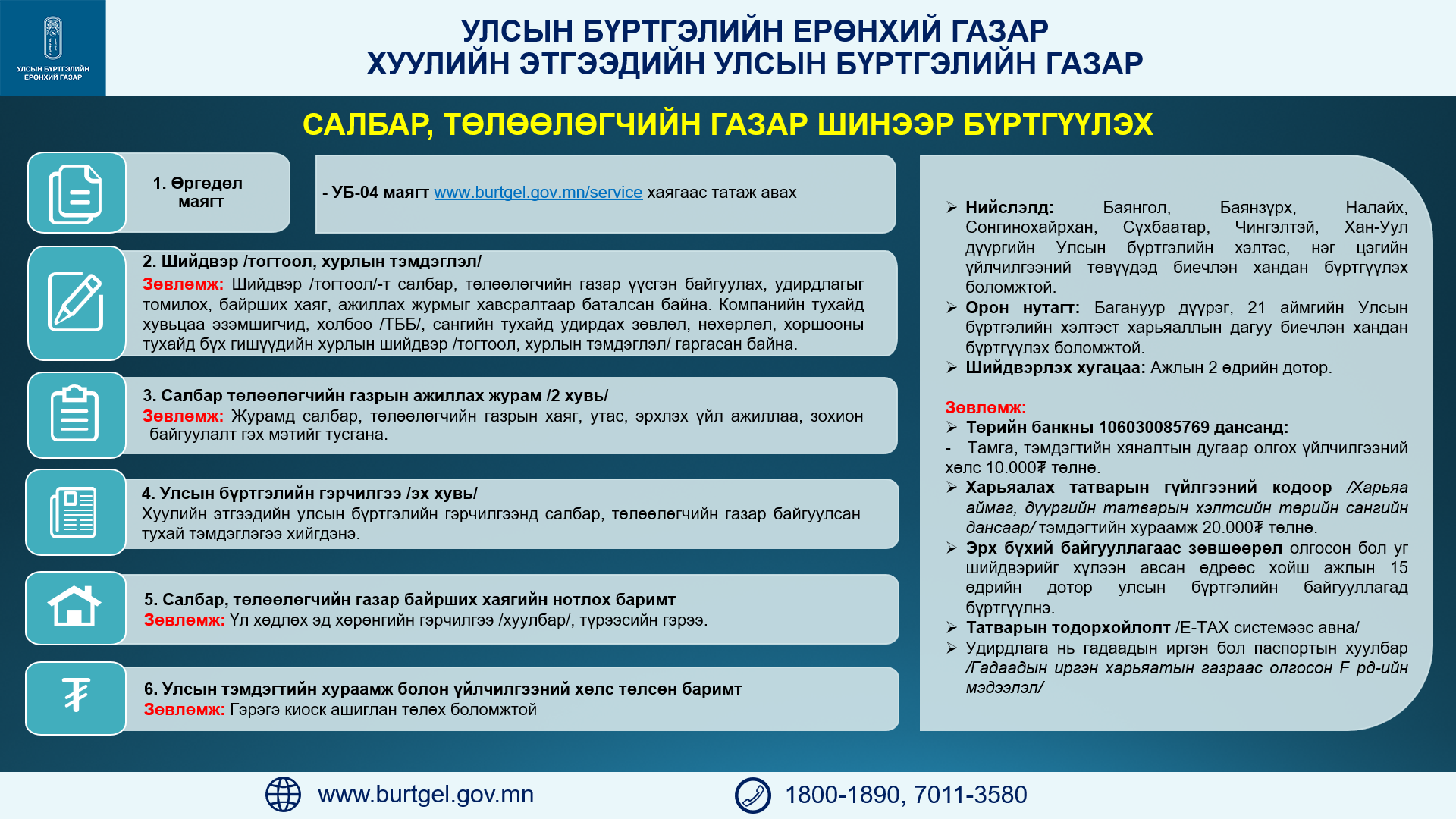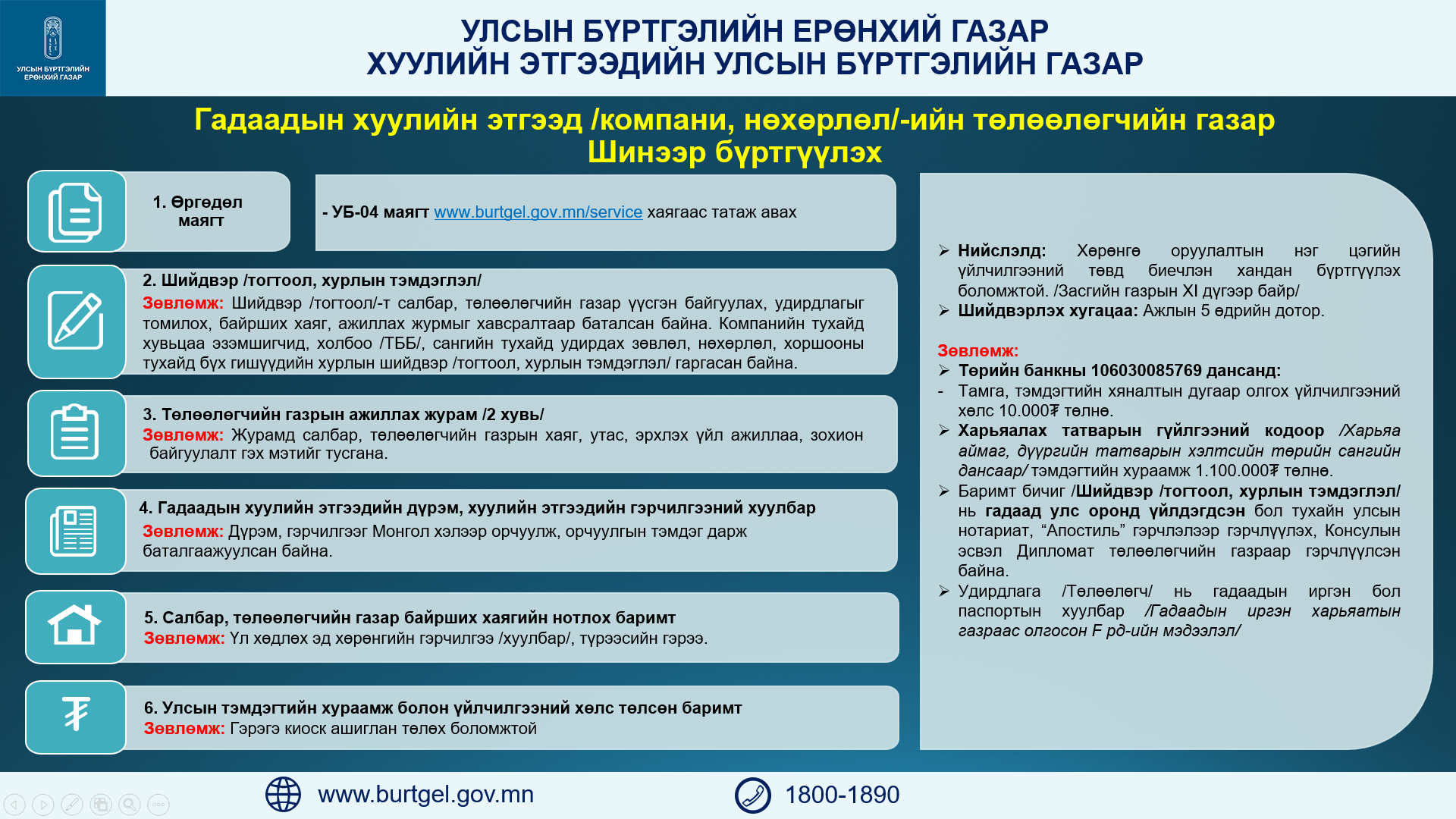 http://burtgel.gov.mn/service/index.php/les-newlist/download хаягаас татаж авах Харьяа аймаг, дүүргийн татварын хэлтсийн дансаар /Улсын тэмдэгтийн хураамжийн тухай хуулийн 15-д заасан/ |